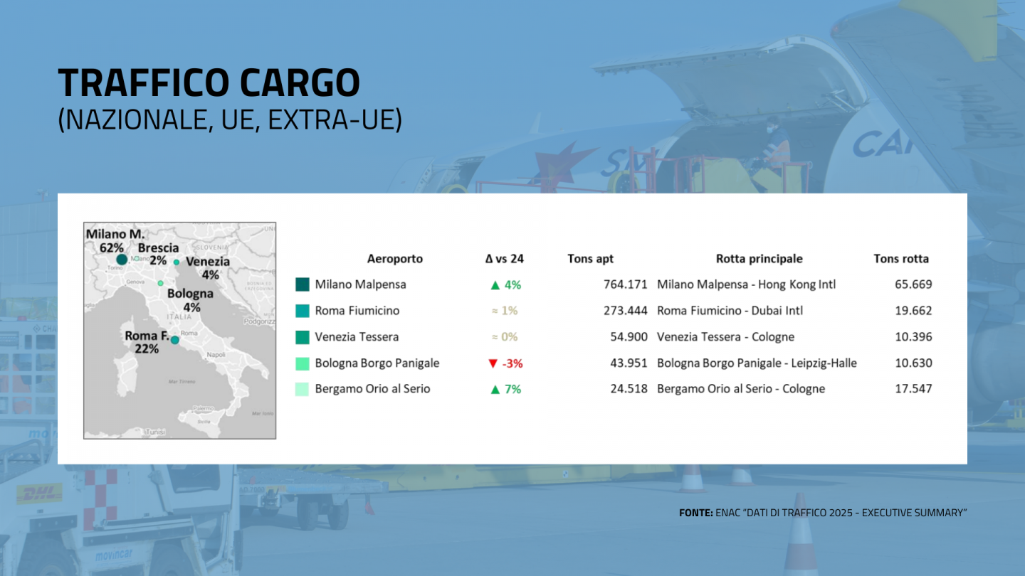 Ma è nel segmento cargo che l’aeroporto varesino primeggia: nel 2025 sono state movimentate 764.171,4 tonnellate che equivalgono al 61% del traffico nazionale. In questo caso la rotta principale è quella che porta verso Hong Kong.