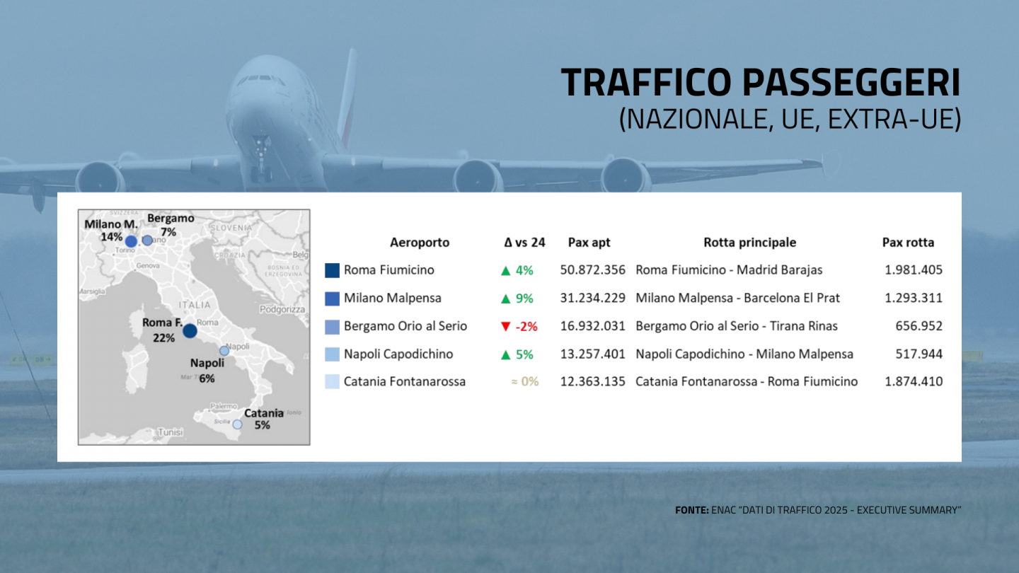 Oltre 31 milioni e 234mila passeggeri e un incremento che in un anno raggiunge l’8,6%. Sono i numeri 2025 dell’aeroporto di Malpensa certificati dall’ultimo rapporto dell’Enac (l’Ente nazionale per l’aviazione civile). Per quanto riguarda il traffico commerciale, lo scalo varesino è quello che cresce di più tra i Top 5 e si conferma al secondo posto dietro a Roma Fiumicino, in testa con oltre 50,8 milioni di passeggeri. La curiosità è legata alla rotta più trafficata che per Malpensa è quella verso Barcellona El Prat con 1.293.311 passeggeri.